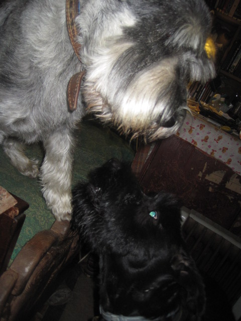 -У-у-у, я был у страшной ведьмы- колдуньи, она превращала меня в ризеншнауцера!!!Она щипала меня и за спинку, и за хвостик,и за лапы, и за шею, и даже за голову...ох и намучился же я, если бы не баранковые "таблетки" храбрости и терпения, совсем было бы тяжело...Но , смотри, я ведь уже совсем Шнауцер... -Эх, как она тебя.... колданула... ты же, вроде как больше был....-М.Атака даже привстал от удивления, и желания получше рассмотреть... - И знаешь, у настоящих шнауцеров, обязательно ,должна быть борода, усы и чёлка...