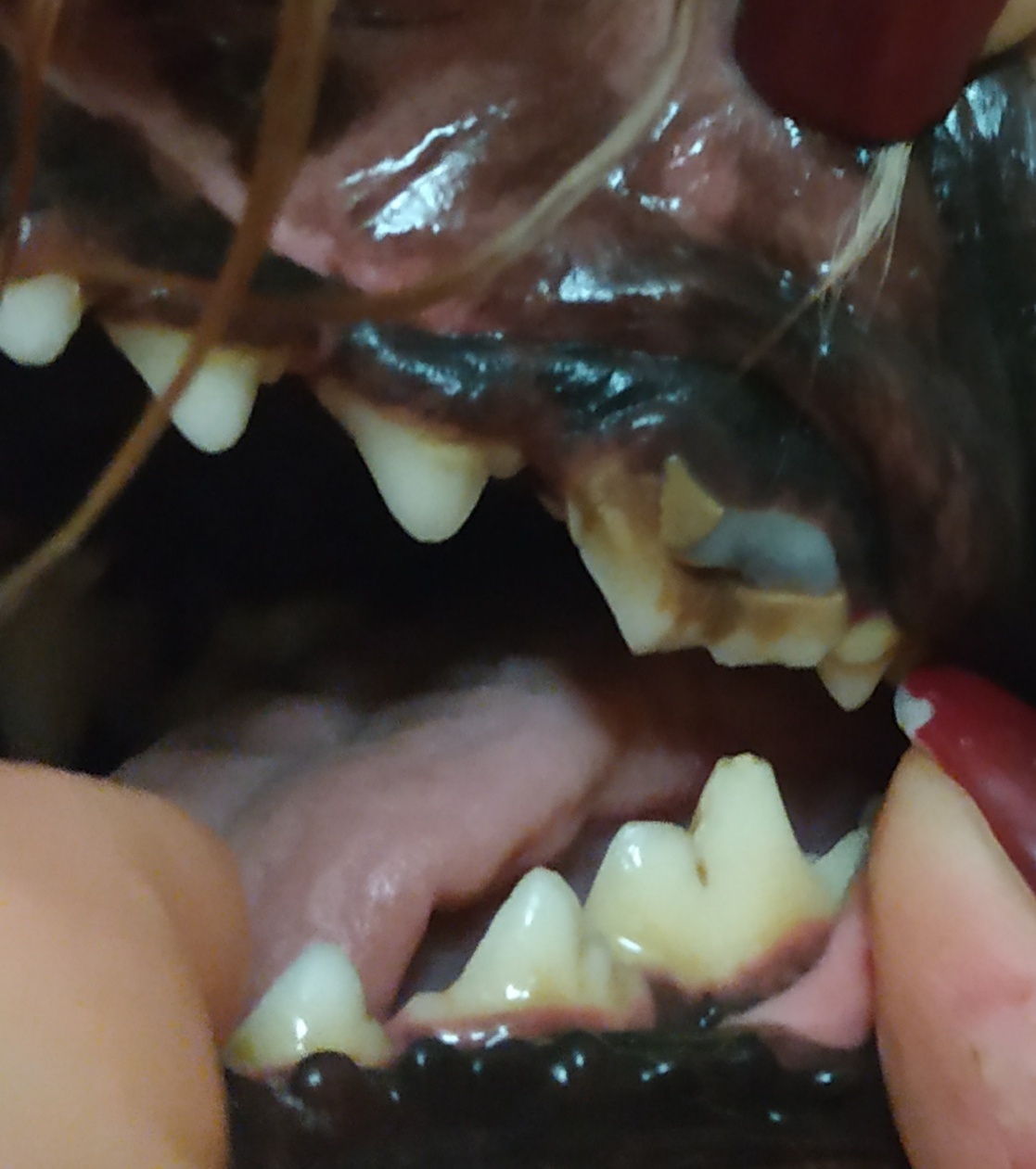 Чизу зубы орозимом всегда была довольна результатом,тут запустила и не чистила почти год,последний раз вывернула пасть практически наизнанку,тут решила счистить налет механическим способом то что счищается а остальное намазать орозимом. Все счистила и увидела последний зуб,ужаснулись,он был весь в Корее,металлическим инструментом для чистки лица стала сковыривать и врдуг кусок налета отлетел и зуб треснул,под налетом была черная коронка. На фото видно черный участок,теперь он подвижен,его можно вынуть рукой я думаю и он кровит. Как не странно собака не испытывает никаких болевых ощущений.