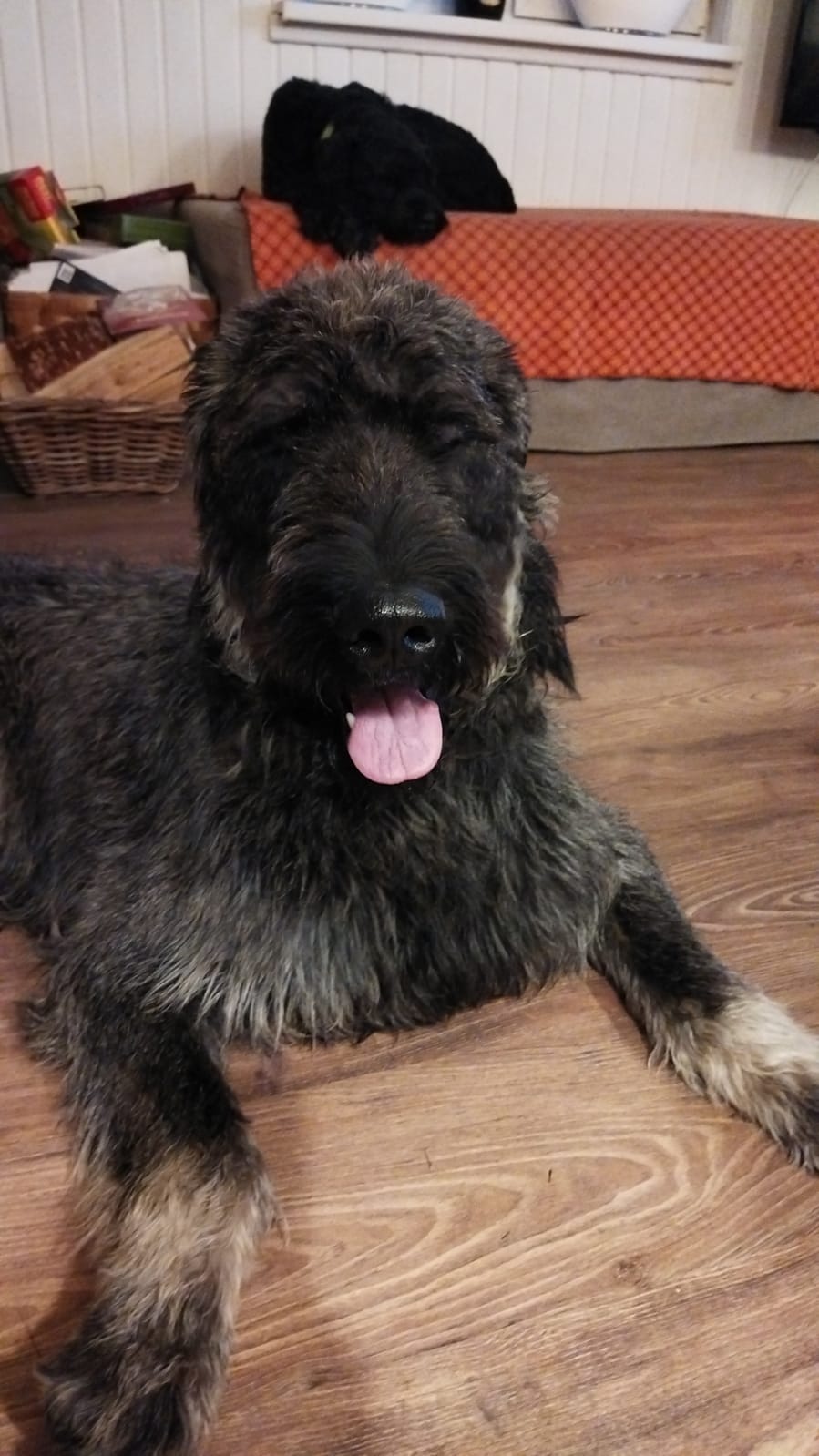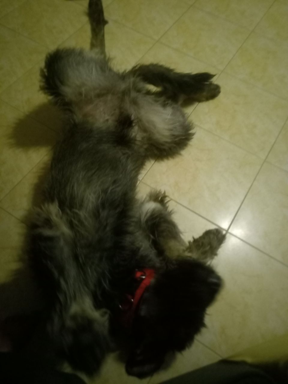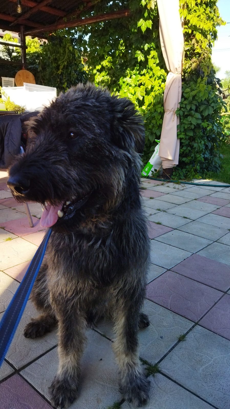 Шерсть у него хорошая, породная, но сейчас нужен тримминг. Украшалка небогатая или обтрепался или обрезана. Щиплется руками отлично. Вонючий, грязный жутко. Привязала в гостиной к столбу, бьётся как муха. Выспался и желает движухи. Поел жадно, даже добавляла порцию.
