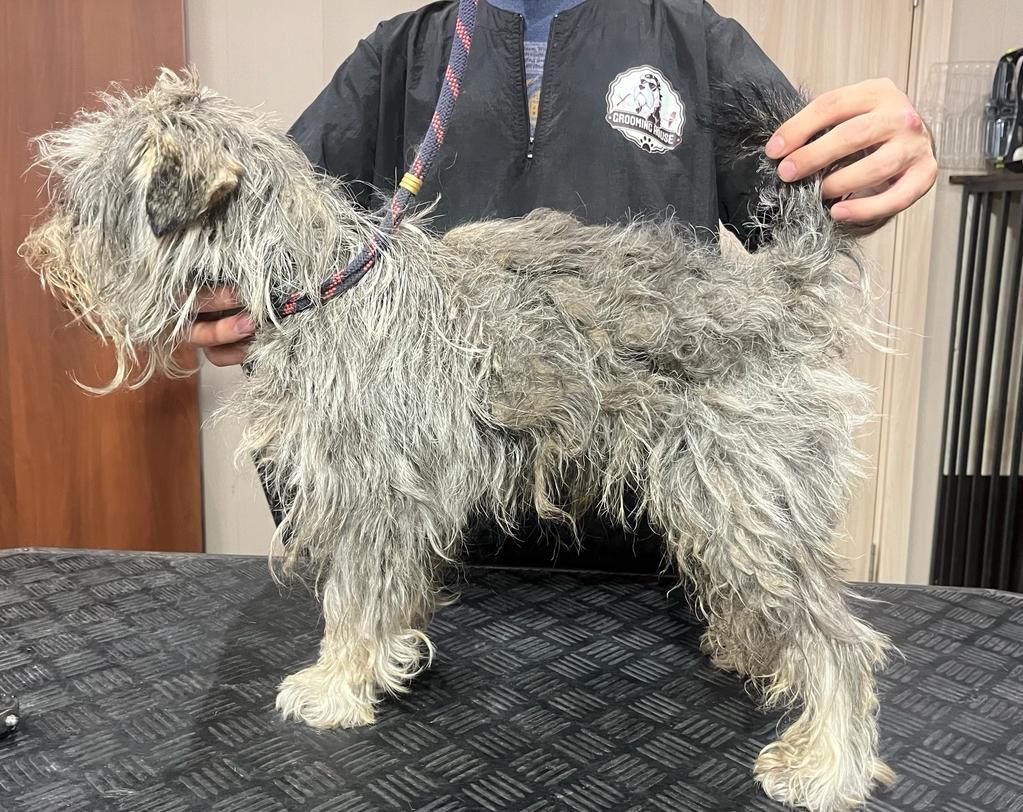 Компактный, спокойный, доверчивый. Шерсть хорошая, тримминг. Весь покусан другими собаками.