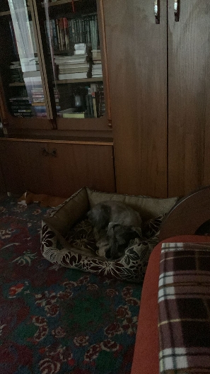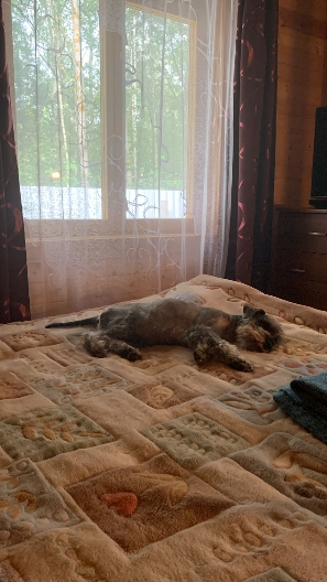 Кровать знаем хорошо( позже Арчун дал ему понять, что кровать и пр. это его, а тебе выделили место). Ирина достала одну из больших лежанок Арчи для Овнера. И пес был счастлив!!!! После обеда как залег в неё спать, так и проспал почти до вечера. У Ирины сердце сжималось , глядя на него...