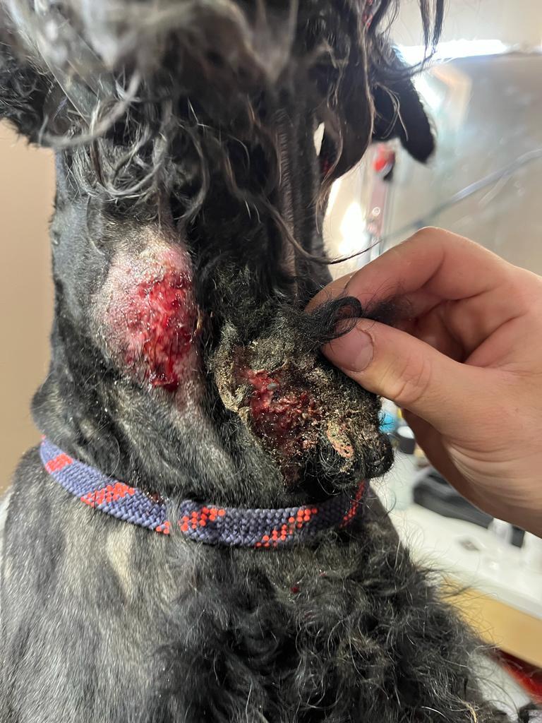 И вот чудо! Он оказался родным братом Карлуши! Чудеса! Что собаке скоро исполнится 11 лет, об этом даже не мог никто и подумать! В процессе триминга ( жёсткий по шерсти) в районе шеи, обнаружилась рана от укуса собаки, которая уже опухла. Все обработали! Тем временем заводчики Берта( а именно так его зовут) Светлана Жукова и Елена Бояркина, подняли свои записи по этому помету и связались с хозяевами.