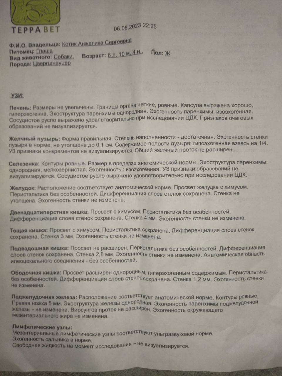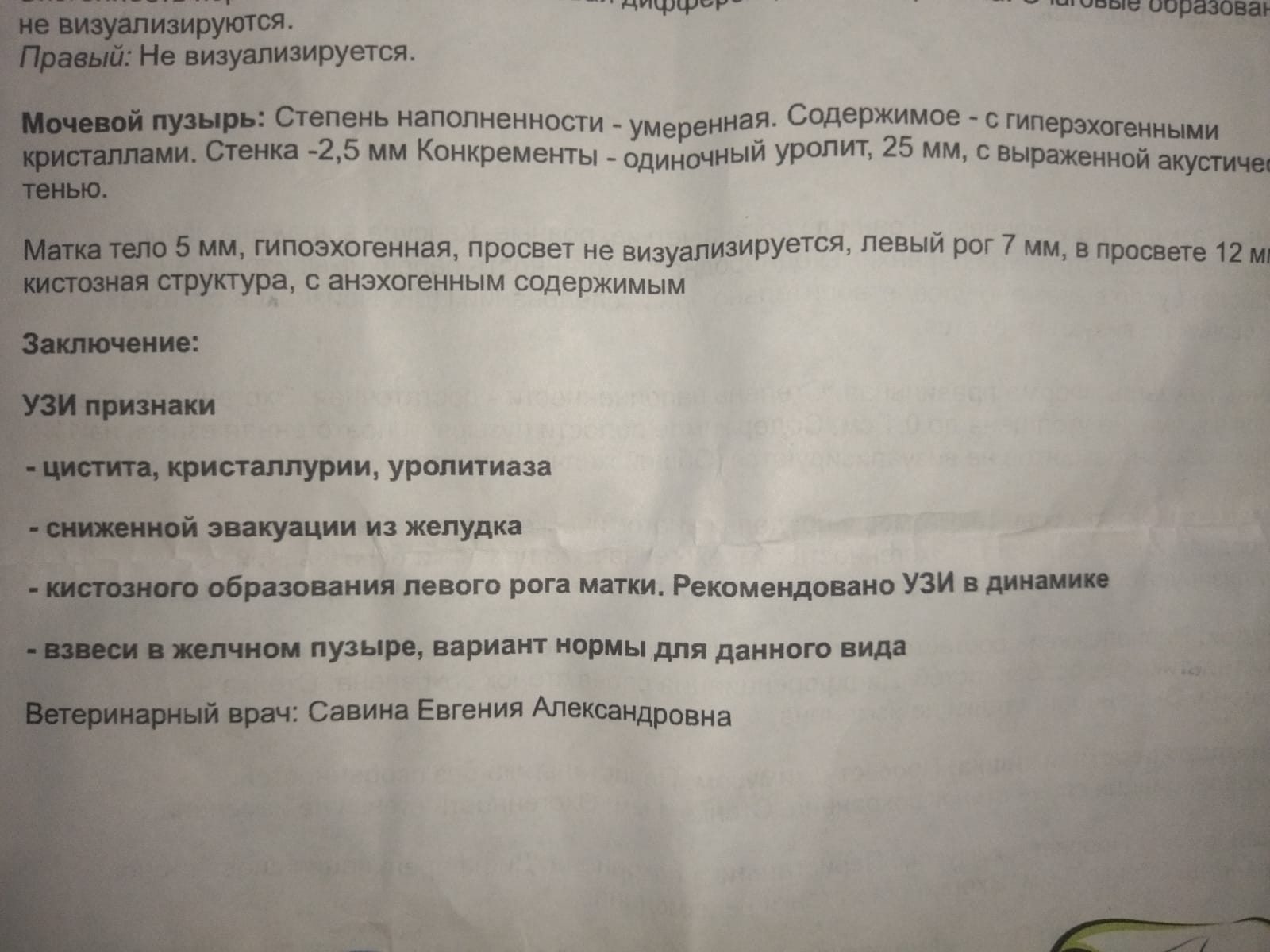 Мочевой пузырь: умеренно наполнен. Стенка ровная, не утолщена, до 1,9 мм. Содержимое однородное, анэхогенное с незначительным количеством гиперэхогенной флотирующей взвеси предположительно минерального происхождения и едииничными крупными кристаллами\микроуролитами до 2,2 мм в диаметре. Конкременты и новообразования не визуализируются. Уретра не расширена, стенки уретры не утолщены.