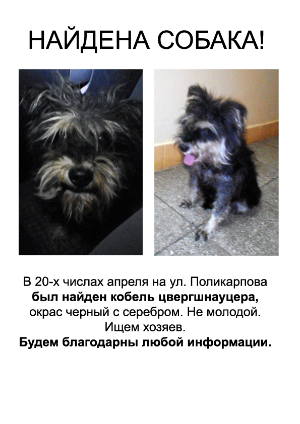 В 20-х числах апреля на ул. Поликарпова был найден кобель цвергшнауцера, окрас черный с серебром. Не молодой. Ищем хозяев. Будем благодарны любой информации.