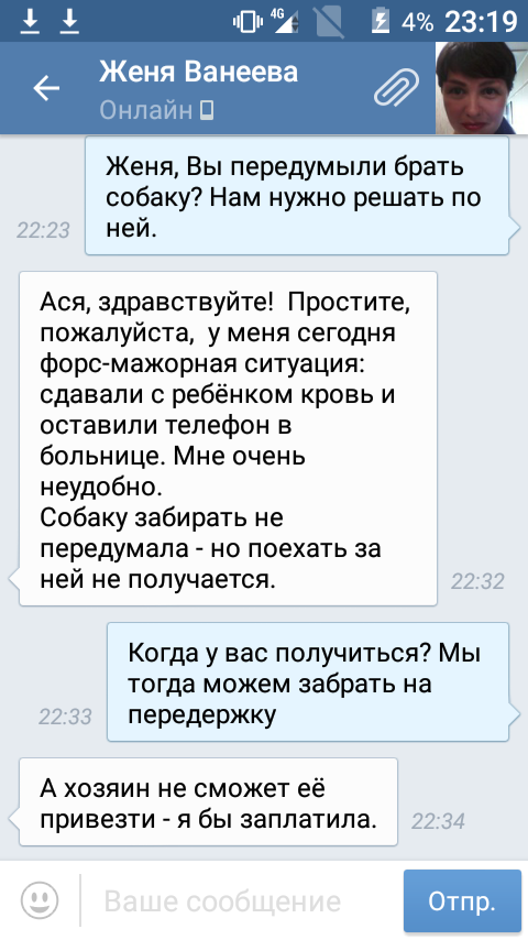 В общем девушка из Тулы не отвечает, так что можно про нее забыть.Не понимаю что за манеры у людей, неужели нельзя просто позвонить и дать знать что б не надеялись!? Собаке по прежнему требуется пристройство.