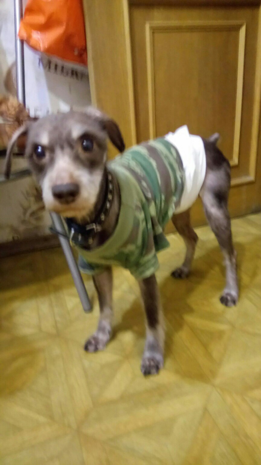Фил, парень не мелкий, высоколапый 38+ в холке на вид будет, не стали мерить, он и так, когда увидел одежду и пакет с памперсами забился под стол, да в общем пока сидели на кухне, он лежа на своем месте под батареей периодически гундел вслух, приехали тут визитеры с "непонятными призентами" :laugh: