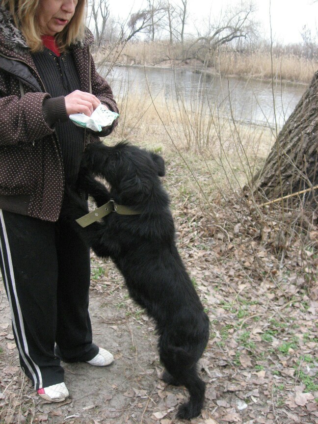 Сегодня съездила сделала новые фото,запорожского щенка !Форумчане жду вашего вердикта!Ася выложит фото,у меня не получилось)))Мое мнение,что это ризененок,учитывая что он месяца полтора назад там появился,потом на месяц пропал и вот уже неделю его придерживают и нормально кормят -он вполне выглядит ризеном.Показывала его фото своему груммеру,породнику миттелей и цвергов.Она тоже видит в нем ризененка. Визуально квадрат присутсивует,если голову в порядок привести ,то и голова неплохая,бугорки есть.Шерсть очень породная,отходит хорошо.Лапы не тонкие,оброслость присутствует,как у ризенов жестких,т.е.она есть ,но без излишества,щетка тоже есть)))Хвост вполне хороший,не бублик и не лабра))) За неделю очень привязался к женщине,ходит хвостиком,к другим осторожно,вкусняшку берет,но соблюдает дистанцию.Чтоб понятней было,это деревня за городом,но в хорошем месте у реки.А в деревне сами знаете главное огород и куры,поэтому никто с ним там церемонится не будет!L.K. писал(а):на первой фотографии похож на нашего метиса - борода, глазки темные...