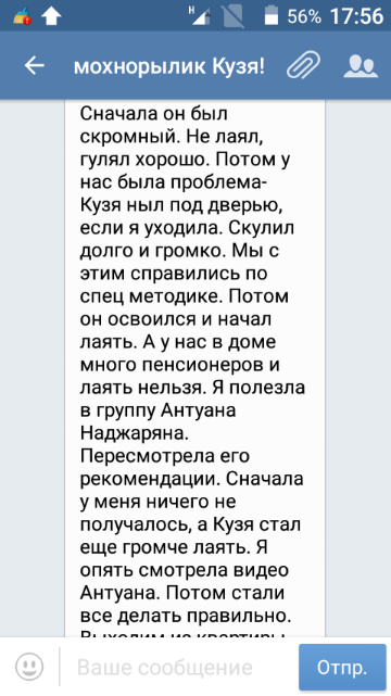 А можно попросить Ольгу прямо пошагово описать свои действия? Вот например сегодняшний вечер - я пришла с работы, собаки меня встретили, успокоились и мы пошли гулять. Кузя спокойно дал одеть ошейник/поводок, мы спокойно вышли из квартиры, спокойно дал мне закрыть дверь на ключ и... тут же начал орать. И если в первый вечер я сделала скидку на то, что где-то в глубине парадной шевелились соседи и он на них среагировал, то сегодня было абсолютно тихо...Дима писал(а):Изначально , Кузя лаял при выходе из квартиры, но Оля не выходила из квартиры , пока он не замолкал. На этом пошло взаимопонимание. Швыряние на Ольгу не было вообще, он только садился и смотрел ей в глаза. Короче проблем с Кузей не было. Она ему диктовала спокойно свои условия и он с ними был согласен. Поэтому Оля была очень удивлена его поведению.