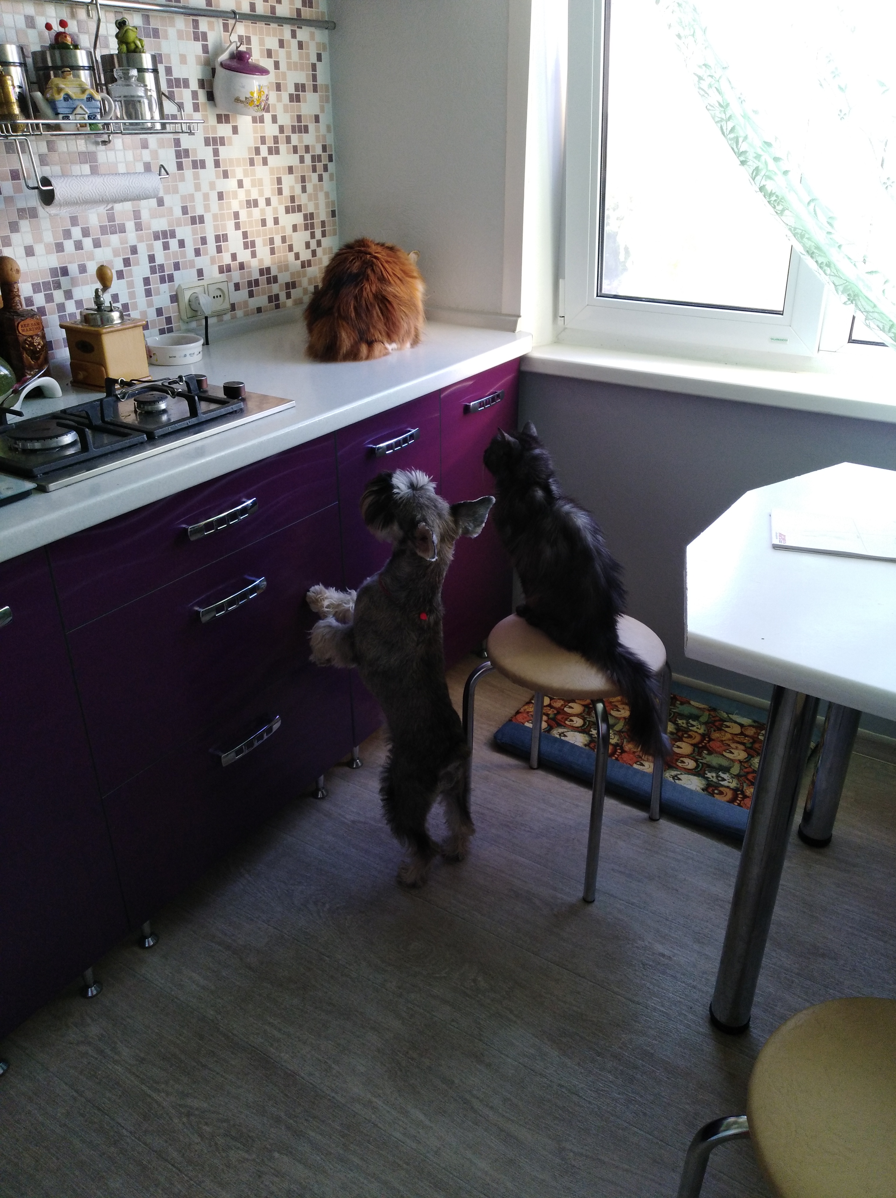 Сегодня курбоб получил 50 гр говядины. Остальные ждали и гадали, что на завтрак будет им. Самое прикольное, что Нюшка мясо чуть понадгрызала и свалила. Ее страть - сухой корм, хлебцы, хлебо-булочные изделия. Жертва прогресса (