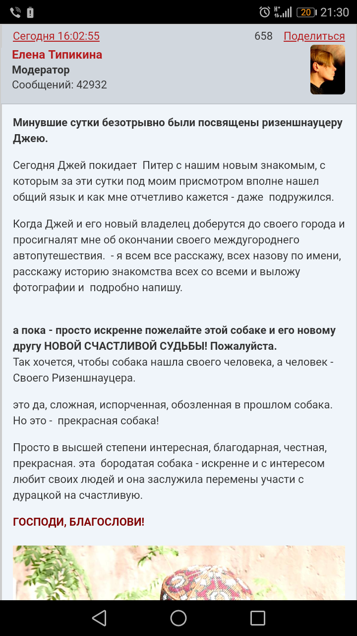 Человека, кто рискнул связать свою жизнь с отказным ризеншнауцером - зовут ДМИТРИЙ. Дмитрию я доверила собаку, мой личный вердикт после суток внимательного наблюдения и взаимодействий был : ДА, я доверяю вам взять на поводок и повезти домой эту собаку.