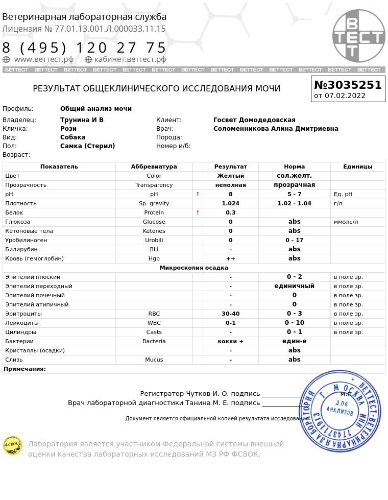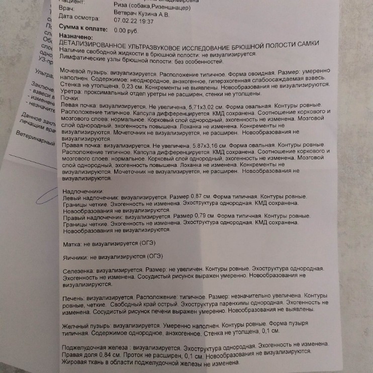 И обязательно сдать анализ мочи, не обязательно через прокол, но собаку предварительно подмыть. Анализ должен быть свежим, желательно до 4 часов хранения, при условии хранения в холодильнике.