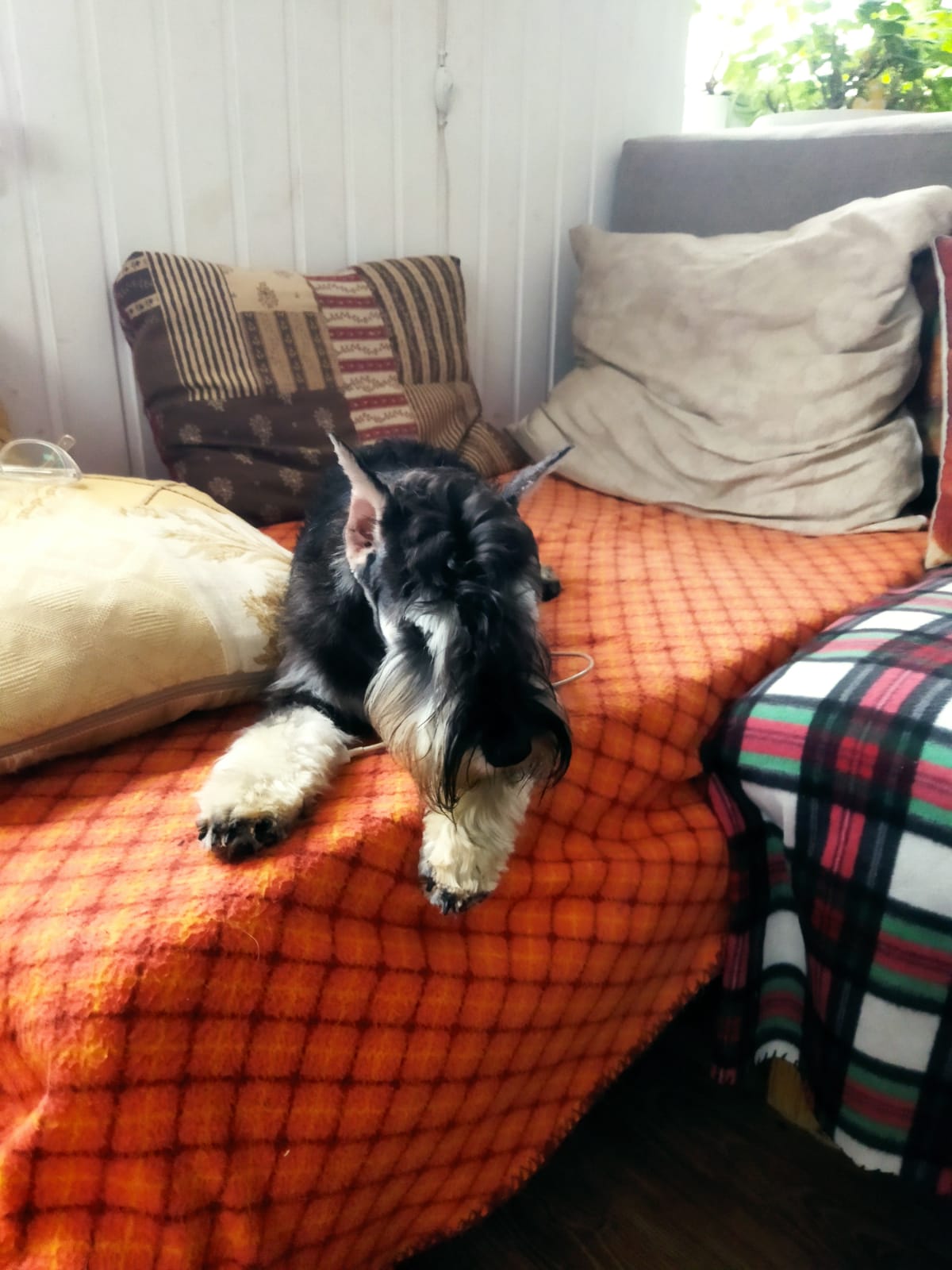 Уши купированы очень длинно и тонко- пламя свечи. Так купировали ризенам в 90- е и доберам. Ласковая, ссыт дома без зазрения совести. Спит на диване, на имя не откликается. Завтра наведу красоту.