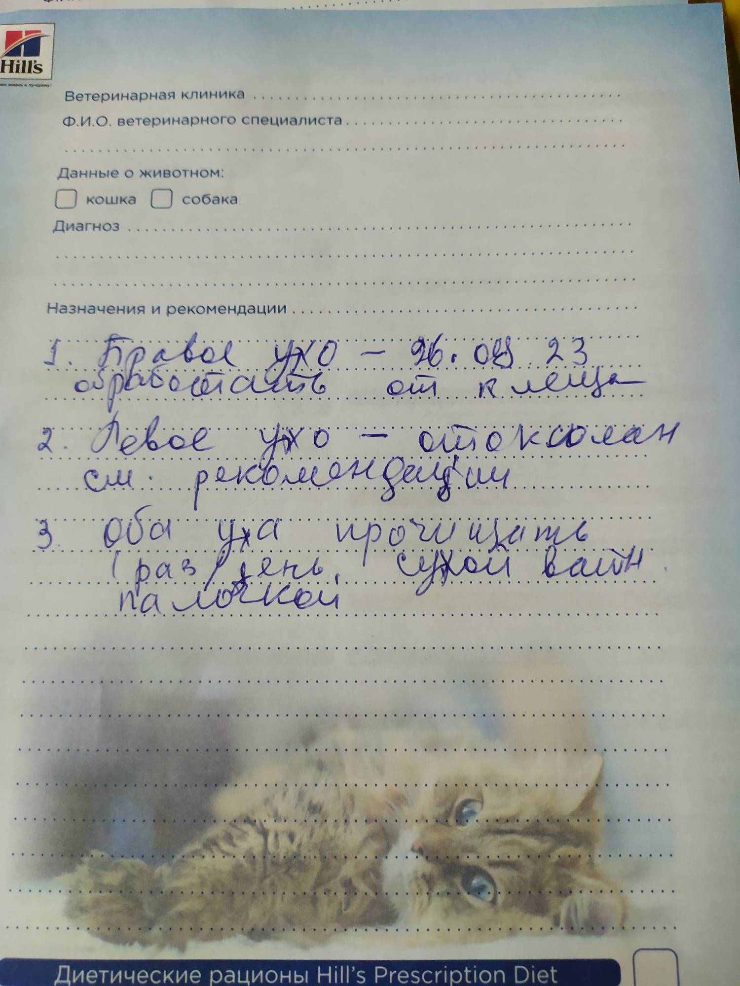 Сегодня мы с Терочкой посетили врача. Поведение у врача выше всяких похвал, спокойно ждала своей очереди: без проблем дала себя осмотреть. болезненную чистку ушей выдержала без звука . Обнаружен клещ, которого надо повторно пролечить 26.08.По поводу левого уха рекомендовано проконсультироваться в клинике Прайд для уточнения диагноза :отит или... Записалась на 04,08 и надеемся на лучшее.