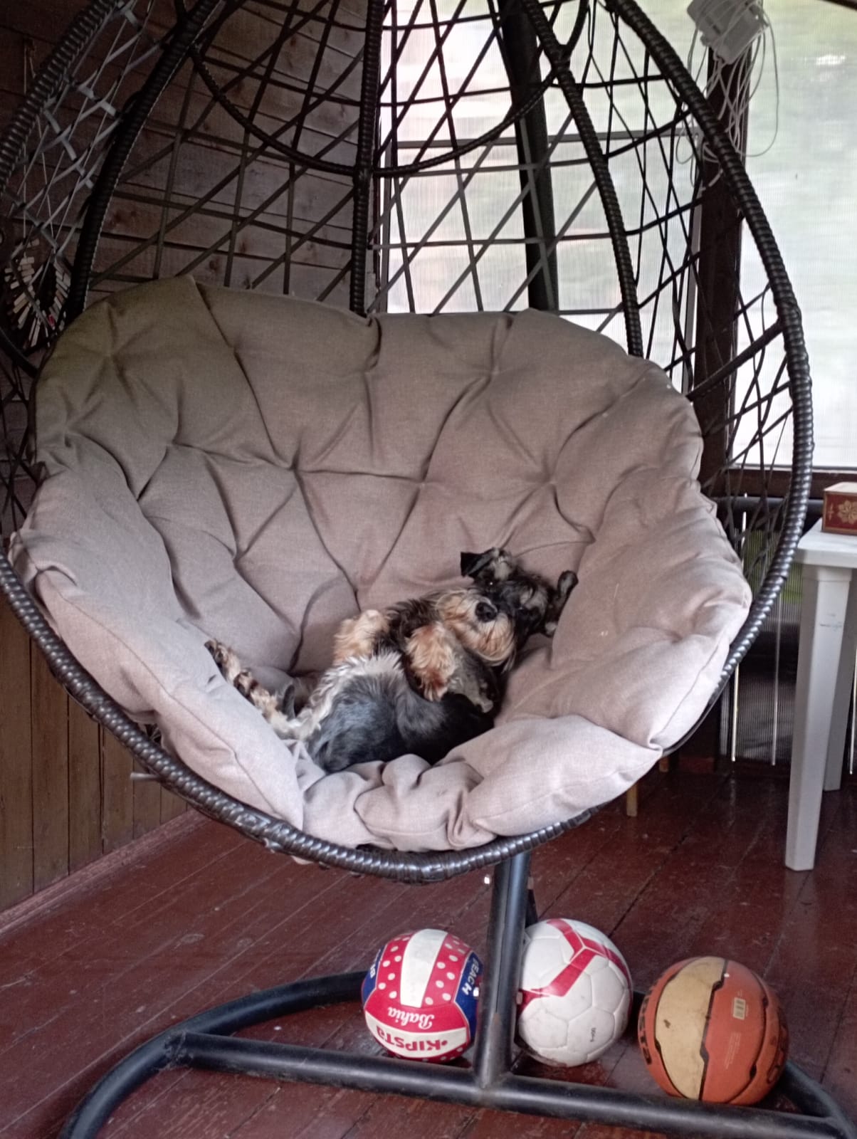 Инна "очистила" ему это пространство! В электричке ехал домой с дачи хорошо! Лежал на подстилочке. Спит на кровати, как и положено цвергу- королю!