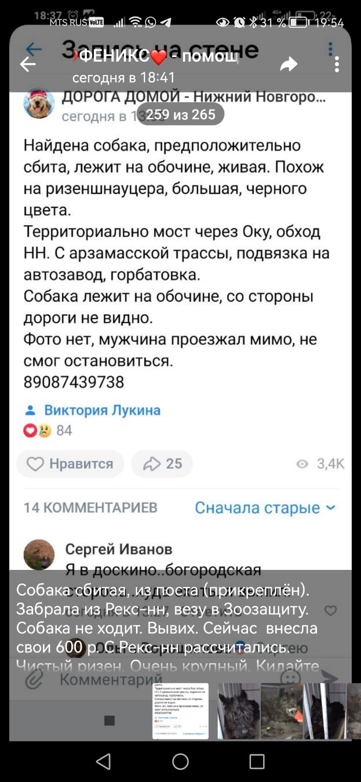 За собакой выехал хороший человек, собаку нашёл там, погрузил и повёз в ближайшую клинику, где провели хороший максимально возможный в их условиях осмотр, хороший человек сам всё оплатил (около 6 тыс. руб.). Дальше подключилась группа волонтёров наших местных Феникс (спасибо им большое!), отвезли собаку вечером того же дня в стационар Зоозащита НН.