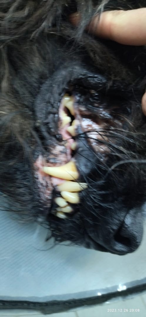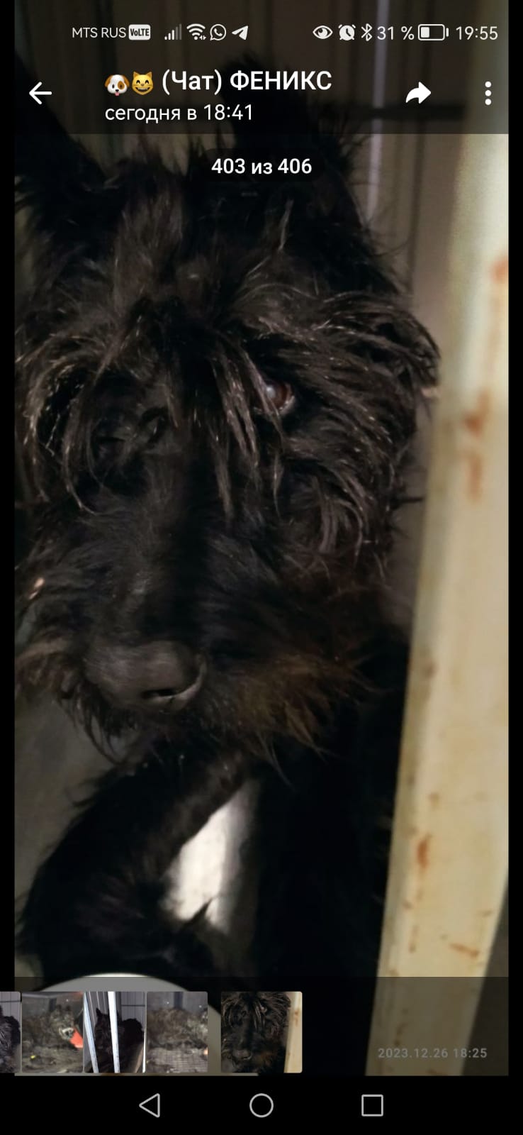 Теперь про собаку - ризен, НЕкрупный, купированный. Вес 29 кг. Некастритрован. Голова большая, хорошая, породная, тельце не крупное, грудь очень узкая. Явный пожизненный недокормыш. Зубы белые, без налёта и желтизны, хоть и подточенные. Голова начала седеть. По виду собаке 5-7 лет. Шкура очень жесткая, вероятно, никогда не знала ни стрижки, ни триминга. Истощенный, за три дня-пять дней так не похудеешь, видимо, это его давно (всегда?) привычное состояние. Нос сверху лысый. Вид давно запущенной собаки.