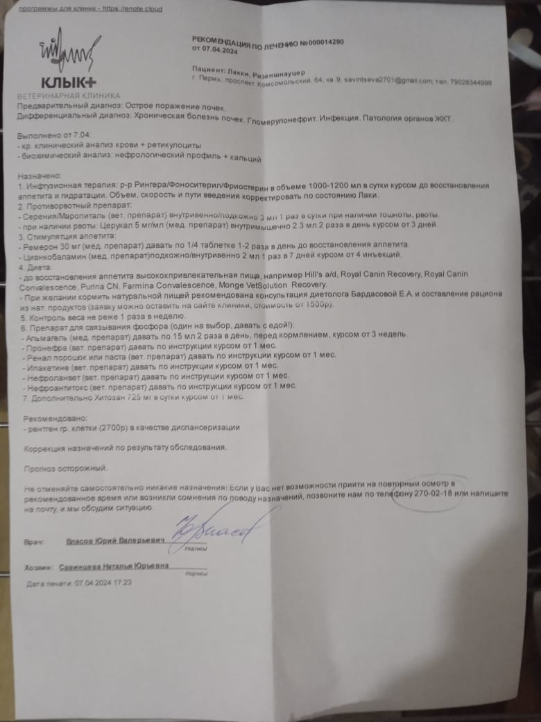Лакки поступил на прием 5.04 с целью консультации, в сторонней клинике по обследованию выявили почечную недостаточность. На момент приема отмечают сниженный аппетит, были эпизоды рвоты (на момент приема нет), принимал вынужденные позы. Дефекация без особенностей. Активность снижена.