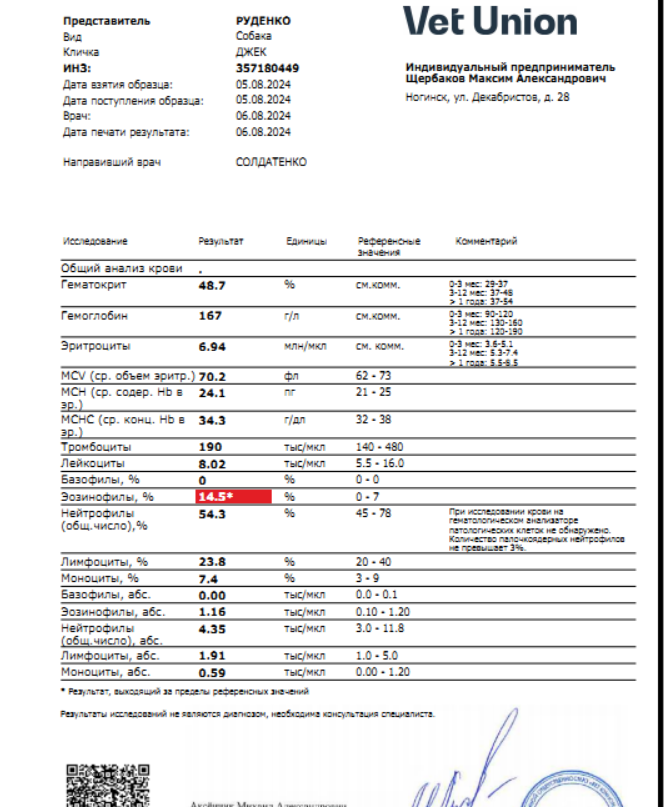 13.08.2024 г.Преднизалон 0,8 в/м. Ивермек 0,2 п/к-1 доза(перв.месяц.).Юнидокс солютаб 100мг.- 1,5 таблетки(утро/вечер) 28 дней.