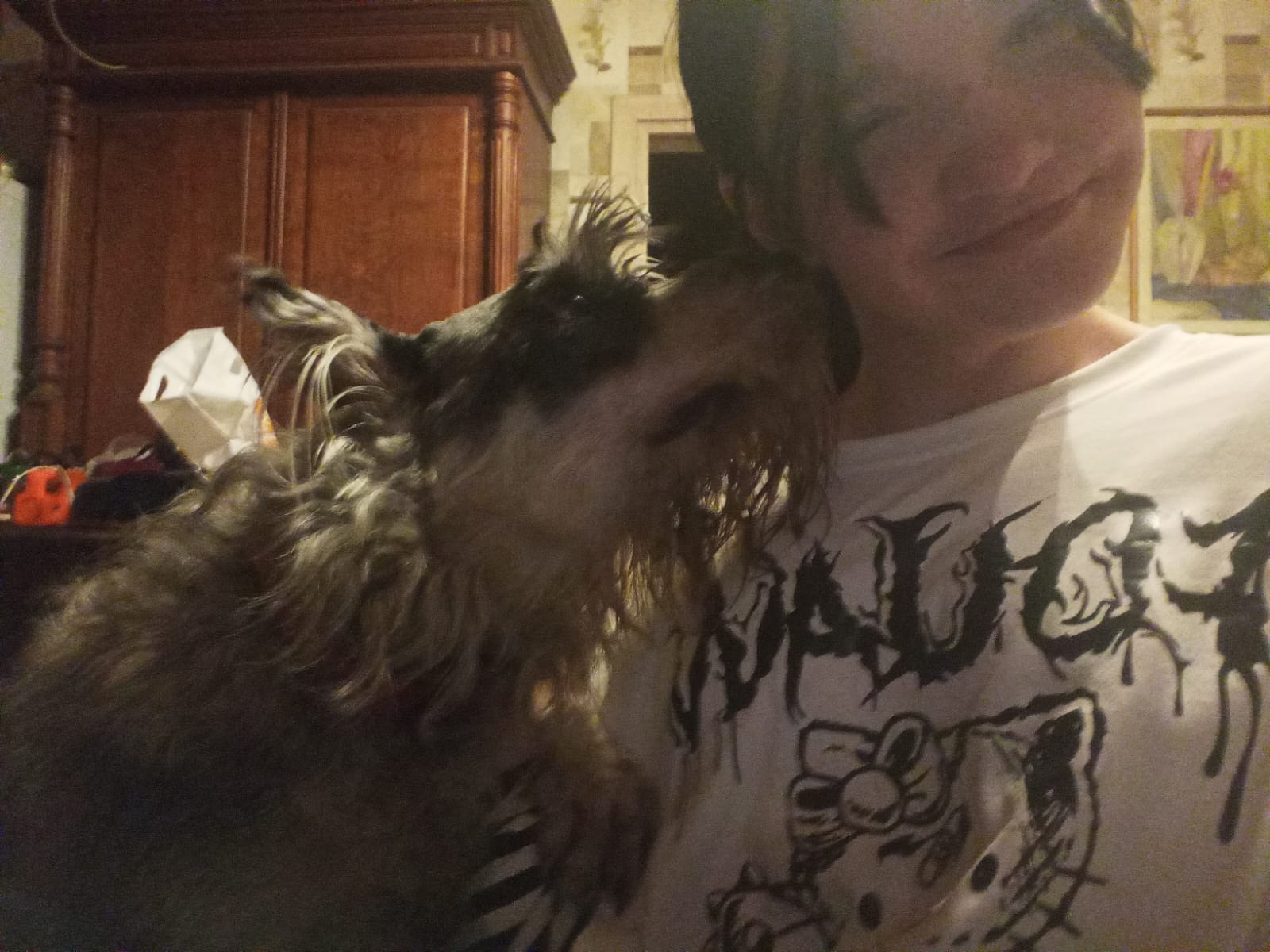 Еще собака твердо уверена, что ни один кусок со стола не должен миновать ее. Поэтому нос может возникать в непосредственной близости между кускоми и моим ртом, мы умеем страдать и громко сглатывать.