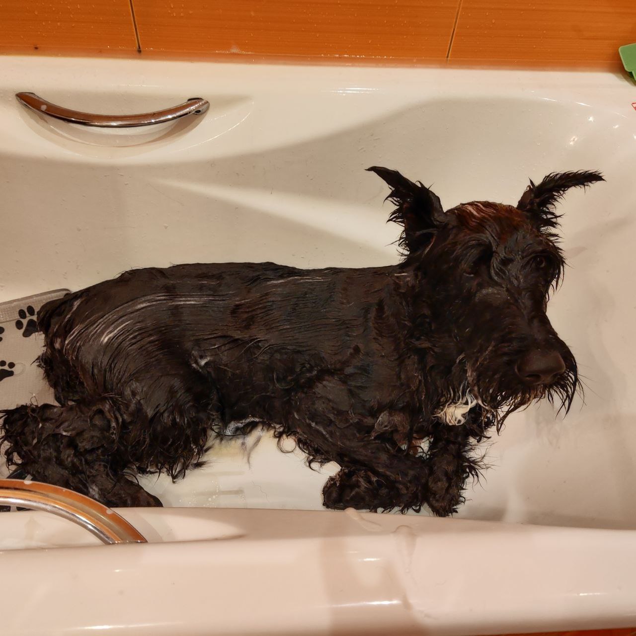 "У Альмы сегодня были первые спа-процедуры дома) Пока мыла шампунем-стояла, после нанесения маски - улеглась) Фен не знает и пока боится, стоять спокойно не намерена, для минимизации стресса и суеты при вычесывании выдала пуллер) От пуллера за 40 минут остались "рожки да ножки", но зато мы теперь блЯстим и вкусно пахнем