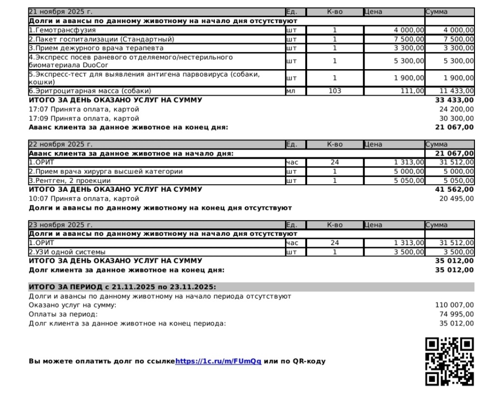 Оплачены 1) предгоспитальный прием с пцр тестами; предвар.аванс за стерилизацию, в случае пиометры/экстр.вмешательство; 2) услуги орит (узи вошло в стоимость