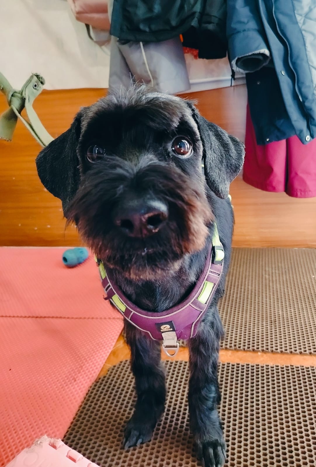 Да, черный миттель. Мы живём в городе Архангельск. Олива вообще первая моя собака, очень хотелось, и выбор упал на миттельшнауцера. Основная наша проблема в повышенной возбудимости. Мы с пяти месяцев занимались с кинологом, но до нужного эффекта так и не дошли, может, я мало приложила усилий( при полной тишине и спокойствии она всё понимает, быстро схватывает, немного начинали ноузворком заниматься, тоже у неё получалось, но доехать до кинолога в машине под громкий лай с заднего сидения для меня суперстресс, потом кинолог стала добавлять при обучении командам посторонний шум, и всё, Олива уже ничего не слышит/не видит, занята только этим шумом. На прогулке, по обычной дороге, где ежедневно ходит, она идёт супер спокойно, если мы идем в новое место - она бежит сразу во все стороны, суетится, всем вокруг активно радуется. Дома то же самое, когда какой-то шум за окном, начинает активно суетится и если сильно волнуется ищет, что бы сожрать, а потом три дня этим какать. Дома писала она довольно долго, лет до полутора, и тоже в основном когда её что-то волновало, шум за дверью, или если с ней очень активно играть. За последний год дома промахов не было на трехразовом выгуле.