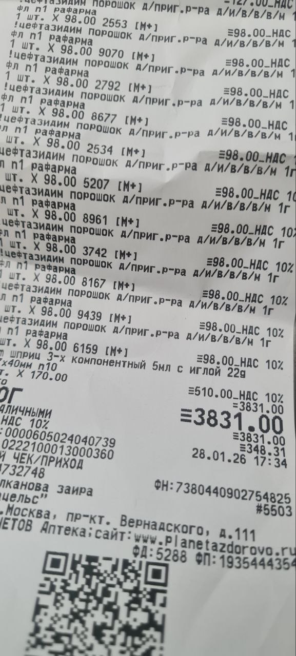 Финансы: шприцы, 30 доз цефтазидима, новокаин, амантадин и габапентин 919+150+4838,50+576=6483,50