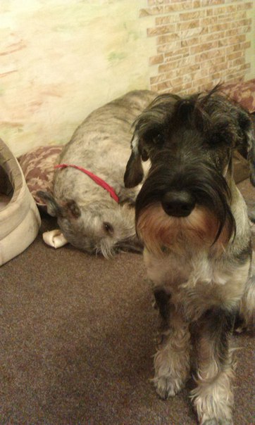 Про Валиру: В тот день, когда я договорилась привезти Валиру в Москву и познакомить с Лизой с утра лил ледяной дождь. Просто стеной стоял. Но тянуть и откладывать я уже не могла, так как через неделю мне надо было обязательно уехать, я уже сидела с билетами. Мы с Валирой поехали на автобусах, Валира в комбезе, я в куртке. Под ногами был снег с водой. Много. Промокли мы обе, я себя утешала тем, что шнауцер вынослив, ему плохая погода не страшна, на то он и шнауцер. Приехали в Москву, отогрелись. Познакомились с Лизой. Не скажу, что Валира прям таки сразу пошла гладится, она полаяла, побегала вокруг, вкусняшки взяла. Мы посидели, поговорили и Лиза мужественно решила прямо сейчас взять Валиру. Таким образом Валира поехала в новую жизнь. Наличие Волкодава меня порадовала, Валира играет достаточно активно и резко, а волкодава трудно попортить.