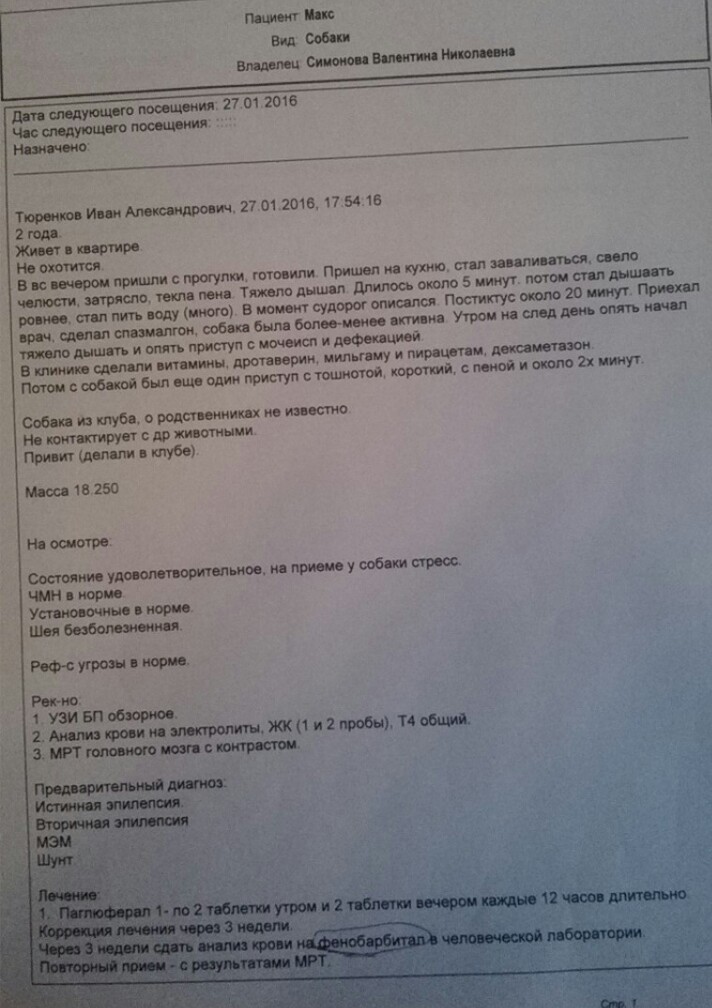 А что сейчас может сказать невролог? Имея припадок очень схожий с эпистатусом. На данный момент наверное и нарушения рефлексов нет. Припадок надо видеть. По описанию были настоящие судороги, была боль, не было потери сознания, причём очень прицельно расспрашивал- рассказывала, как у собаки потерю сознания определить - сознание не терял. Непроизвольные дефикации и пена из рта, не специфические признаки. Но при такой силе судорог без потри сознания, очень не характерно для эпи статуса. Если на отдаленном доступе ошиблась и потеря сознания была, то конечно это эпилепсия, а вот первичная или вторичная( опухоль, травма) вопрос. Ситуация в том, что если это отравление, то скорее всего пёс вышел из него с минимальными потерями, если эпилепсия, то нужно давать сразу противосудорожный препарат. У людей проще, МРТ, энцефалограмма. С собаками проблематично. И не только в расшифровке ээг, но и в проведении стимуляциооных проб, рассчитанных на человека.