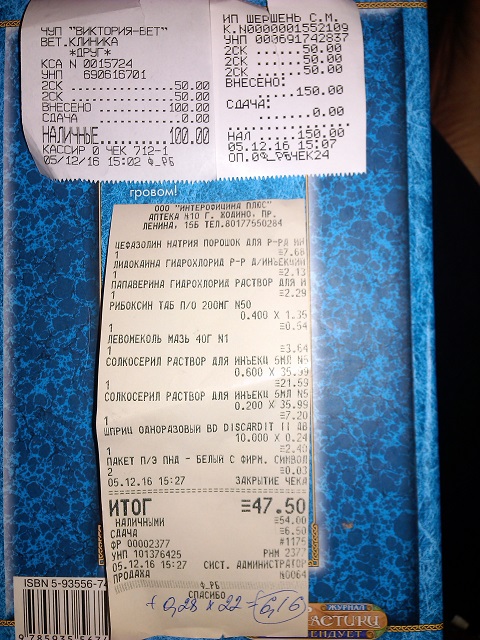 по минским меркам операции обошлись не так и дорого - в стоимость вошли еще воротник и метастоп на полкурса. Оплату операции нам выбили разными чеками (наши клиники это практикуют практически все, с разных терминалов) на 100 и 150 рублей.