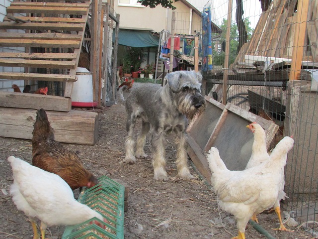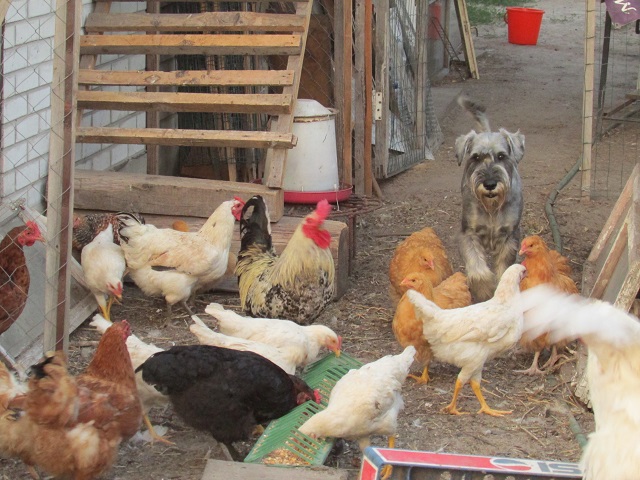 Какие курицы красивые, пестрые! Грей себя вполне уверенно среди них чувствует.