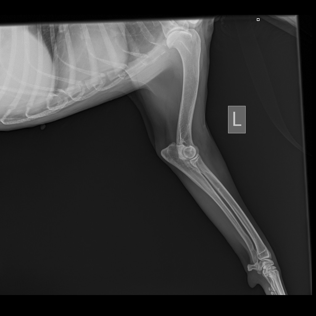 На обзорной рентгенограмме скелета левой передней конечности определяется: