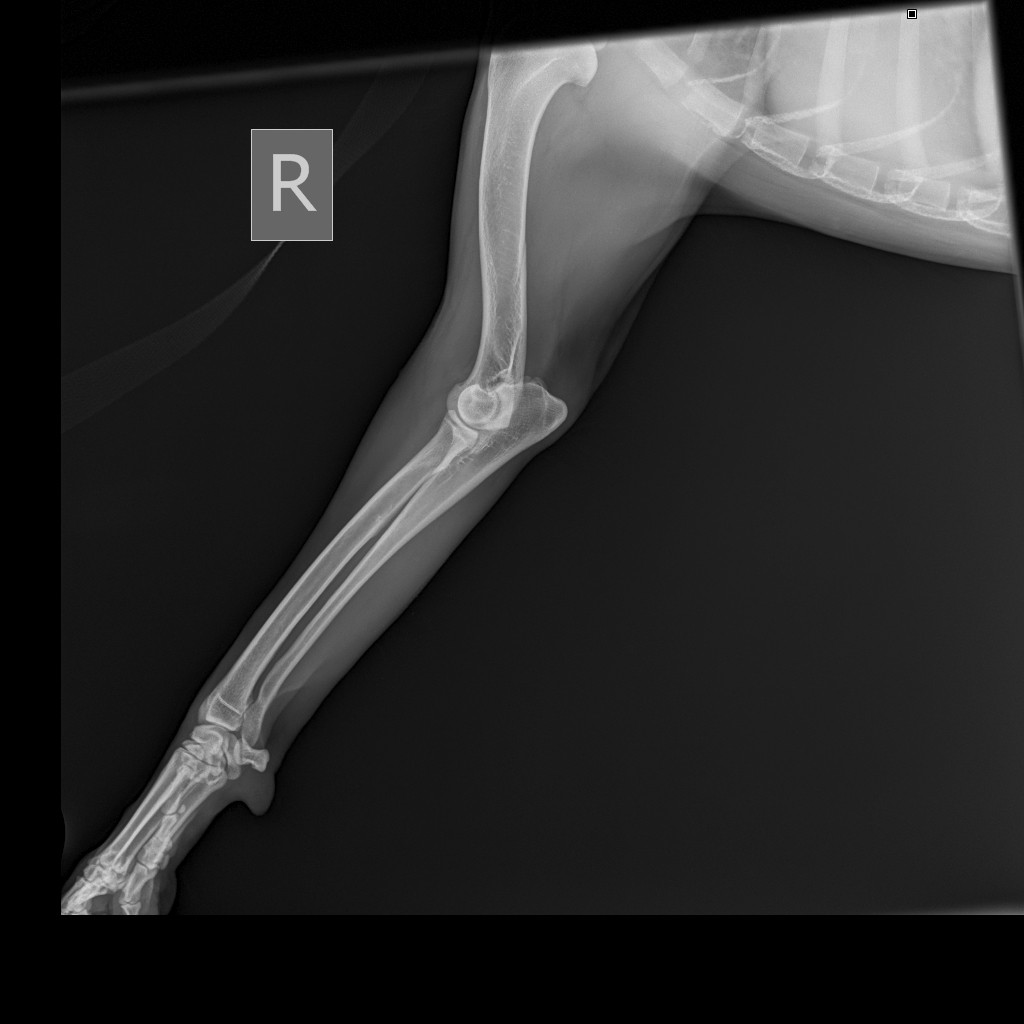 На обзорной рентгенограмме скелета правой передней конечности определяется: