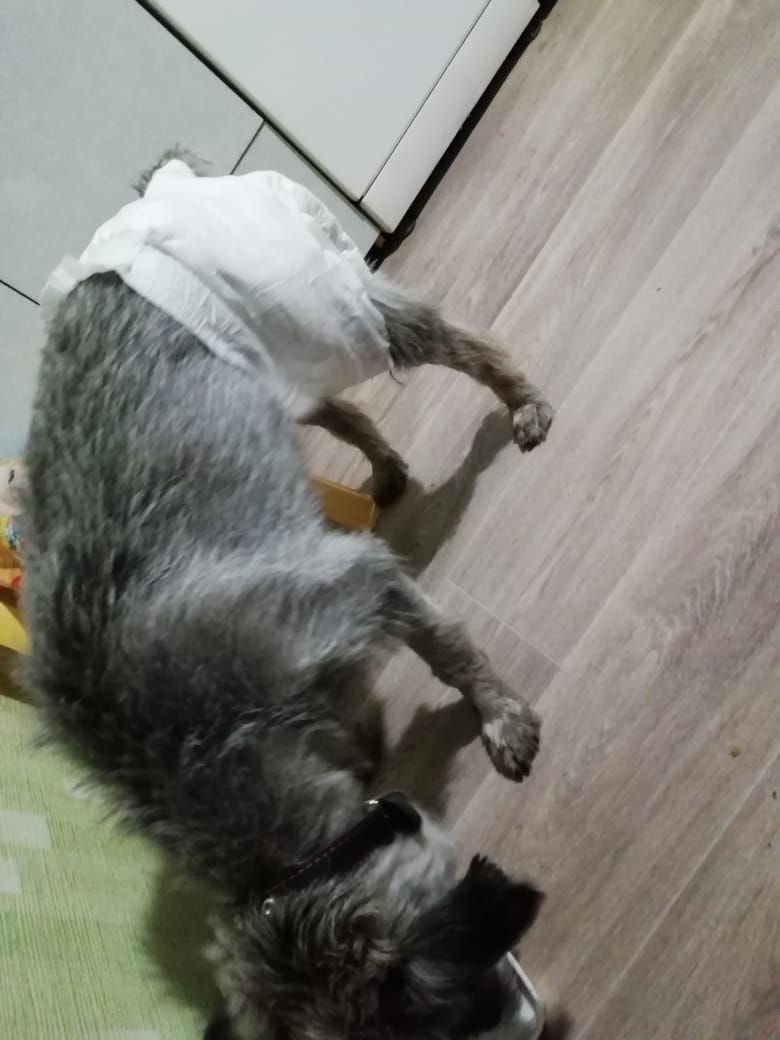Привет от Чупика! Чупик потихоньку осваивается. Ночью идёт в комнату младшей дочери Кати смотрит на неё,когда она спит,и хвостиком влияет. Катя несколько раз ночью выводит его на попис,т.к.терпеть долго он не может. Одевали памперсы,но он их снимает. На фотке он прямо повеселел.