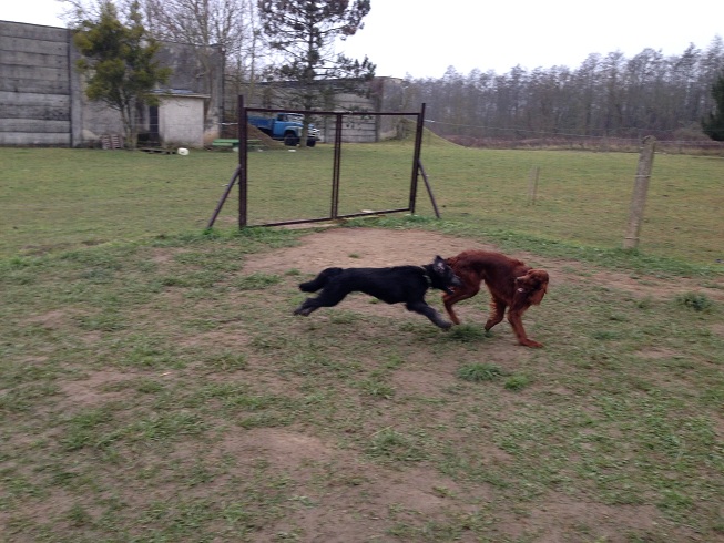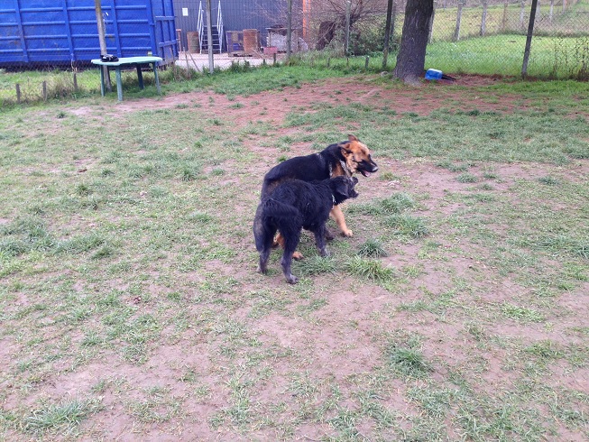 К сожалению, самое интересное осталось за кадром. Феня не побежала за немцем, а стала что-то вынюхивать и ковырять в траве. Немец пытался Феню шишечкой дразнить, но она, отворачиваясь от него, продолжала что-то ковырять и вынюхивать. Немец не выдержал и подошёл, чтобы понюхать, чего там такого интересного нашла Феня. Именно в этот момент Феня и выдрала у него изо рта шишечку. Немец даже разлаялся от досады. А Фенька такую ехидную мордуленцию состроила. Типа: «Не фиг расслабляться, когда я рядом». Бедный немец попался на этот приём ещё дважды