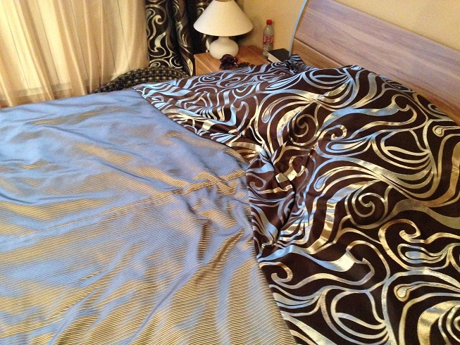 Предыстория такая. Нас не было дома около 4-х часов. Судя по вмятине на покрывале моей кровати, Феня охраняла скалу советов от врагов (то есть, от лабрадора). На мой вопрос: "Что это? Кто здесь лежал?" Феня ответила, что к вмятине на покрывале не имеет вообще никакого отношения. Решительно никакого. Она вообще понятия не имеет, что такое кровать. Она всё время вот тут лежала и никуда не отлучалась никогда