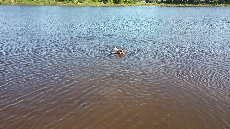 А у нас лето-жара, купаться ходим каждый день :yahoo: утром людей мало, только рыбаки, да собачники. Янчик плавает, как рыбка, бегом спускается к затоке и ждет, пока палочку я буду бросать. А когда я поплыла - вот, жаль, нельзя было снять из вода выражение морды: эй-эй, мать, ты что, тоже плаваешь??? а это наш Днепр, затока :eh: