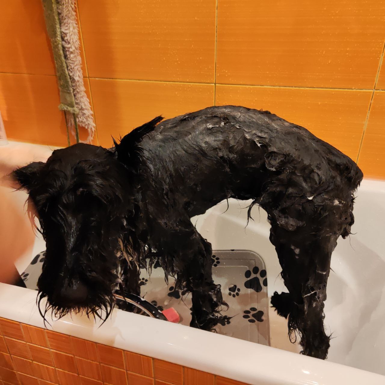 "У Альмы сегодня были первые спа-процедуры дома) Пока мыла шампунем-стояла, после нанесения маски - улеглась) Фен не знает и пока боится, стоять спокойно не намерена, для минимизации стресса и суеты при вычесывании выдала пуллер) От пуллера за 40 минут остались "рожки да ножки", но зато мы теперь блЯстим и вкусно пахнем