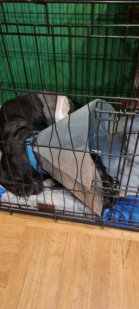 Ну вот Брунечка и дома! Вполне бодр, но на правах больного несчастного песеля хнычет и ноет, недоволен воротником и клеткой. Все в норме, будем выздоравливать. Снимать швы и рентген через 2 недели.