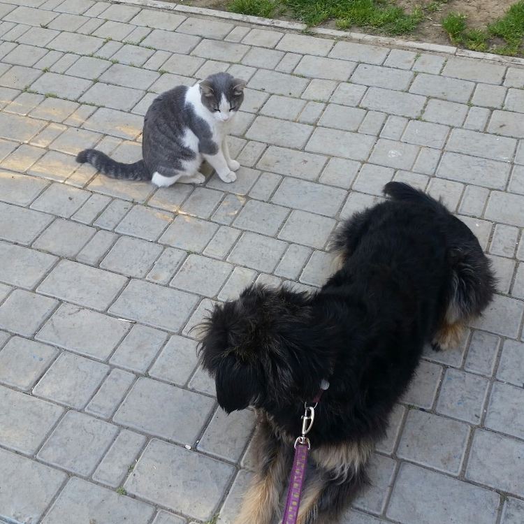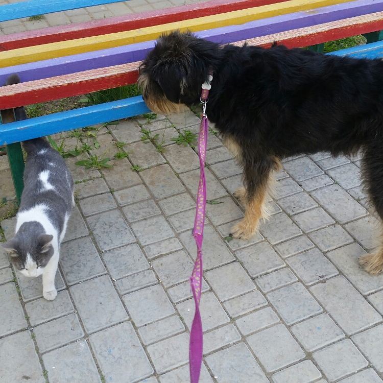Из последних событий, Линда подружилась с кошкой. Кошка живет у нас во дворе и периодически в нашей парадной. Линда все пыталась ее гонять, но кошечка оказалась умней, хитрей и наглей))) Просто подошла, замурчала и протерлась об Линдину мордельку))) Ну, тут уже Линда обалдела и ей стало не удобно гонять кошку. Теперь, когда они видят друг друга, то здороваются, кошабринка обязательно ткнется носом в нос))))