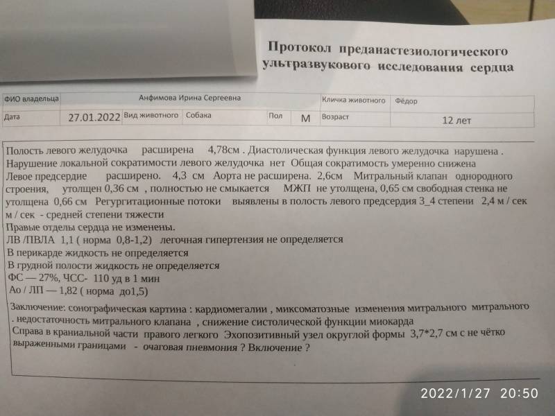 К сожалению, когда попадается вот такая старая собака с кучей проблем, то даже не знаешь, с чего начать. В принципе, логично было показать его онкологу и стоматологу. Но, как оказалось, каждый специалист видит проблему только под своим углом. Онкологи готовы были оперировать, но предполагали еще и возможную резекцию челюсти. Стоматолог считает, что операция относительно несложная, максимум с удалением нескольких окрестных зубов. Но тут же возникает ситуация, когда за операцию не готовы браться и отвечать анестезиологи – собака кашляет, сидит на преднизолоне после непонятных приступов. То есть, они говорят, что наркоз собака переживет, но вот выходить из него она должна в стационаре, под присмотром бригады реаниматологов, и не гарантируют, что ситуация с приступами не усугубится. Оба УЗИста сердца тоже говорили, что прямых противопоказаний к наркозу нет, но вот данные их УЗИ (с разницей в две недели) сильно отличаются, причем в сторону ухудшения. Один из кардиологов, с которым я советовалась без собаки, только с карточкой Федора, сказал, что разница могла получиться при замерах в разных проекциях, но оба описания УЗИ очень «куцые», малоинформативные. Второй кардиолог, с которым еще советовались по проведенным исследованиям, вообще видит как будто результаты двух разных собак. Он же предлагает назначить Ветмедин как превентивную поддержку перед операцией – и здесь тоже мнения у специалистов расходятся. И совсем непонятно, что за образование появилось у Феди в легких. Возможно, это пневмония или бронхит, так как сейчас есть улучшения на Синулоксе – кашель стал меньше и уже, как минимум, не затяжной. Но исключать версию онкообразования тоже нельзя… Именно поэтому большинство врачей настаивает на КТ-онкопоиске. И, как мне кажется, здесь риск обследования значительно меньше риска потерять собаку после операции. КТ проводят под малой дозой пропофола, пациент просто ненадолго засыпает. А вот если у Федора есть опухоли с метастазами в других органах, то операция во рту с большой вероятностью подстегнет их рост… Там даже на первом УЗИ есть, кстати, и замеченные очаги в селезенке, например.