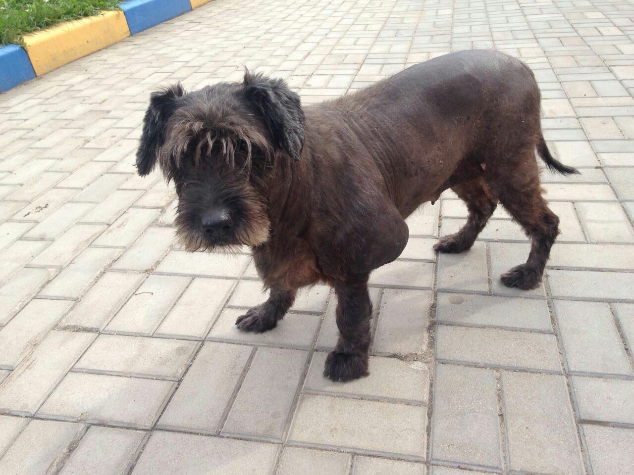 МО,г.Жуковский,на ул.Гагарина бегает вот такая больная девочка цвергшнауцера!как оказалась на улице пока не выяснено,выглядит ужасно.. Говорят, её выбросили хозяева, не желая лечить. Она прибилась к стае бездомных собак и бегает с ними.