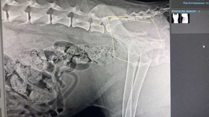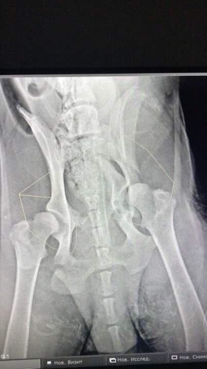 Двойной перелом таза без смещения. Чипа нет. Клеймо не рассмотреть -очень волосатое брюхо.