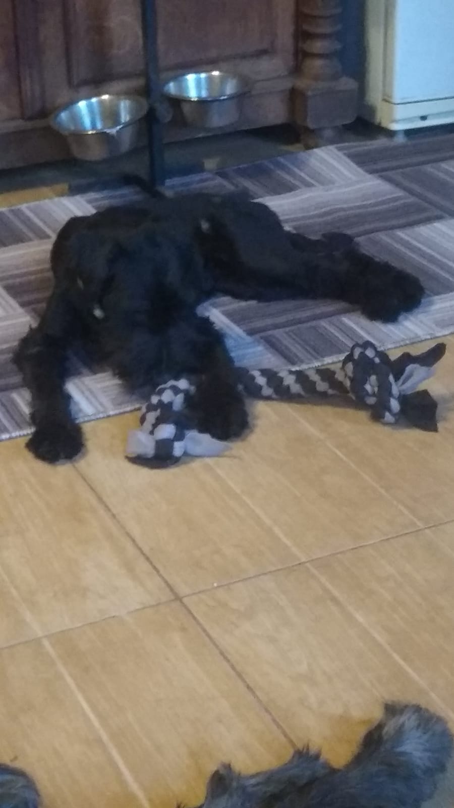 Хорошая девочка Булочка приступает к ожиданию хозяев с завтрашнего дня. Булочке 5 месяцев и она черный миттельшнауцер.