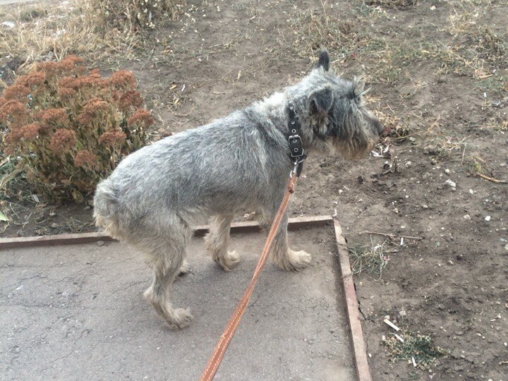 Миттельшнауцер, кобель, окрас серый, хвост купирован, уши стоят, в ошейнике, не молодой. Ищем старых хозяев или отдадим в добрые руки. Обращаться по тел. 8 900 490 00 22