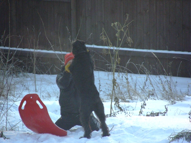 Вчера во время прогулки с женой и дочкой на санках, Майка почувствовала, что жене тяжело тянуть санки в горку и со всей ризеншнауцерской силой вытащила их за 6 сек. Прям посмотрела так, оценилас ситуацию и потянула. Вот.