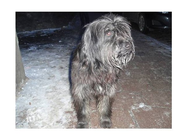 Пёс очень милый, я сначала подумала, что он домашний, и скорее всего потерялся. Немного сбитая шерсть на лапах и попе, и не помешало бы подстричь. Размером он выше колена, полностью чёрный, немного похож на шнауцера, что-то среднее между ризен и миттельшнауцером. Только, как по мне, шерсть более мягкая. Но не уверена.