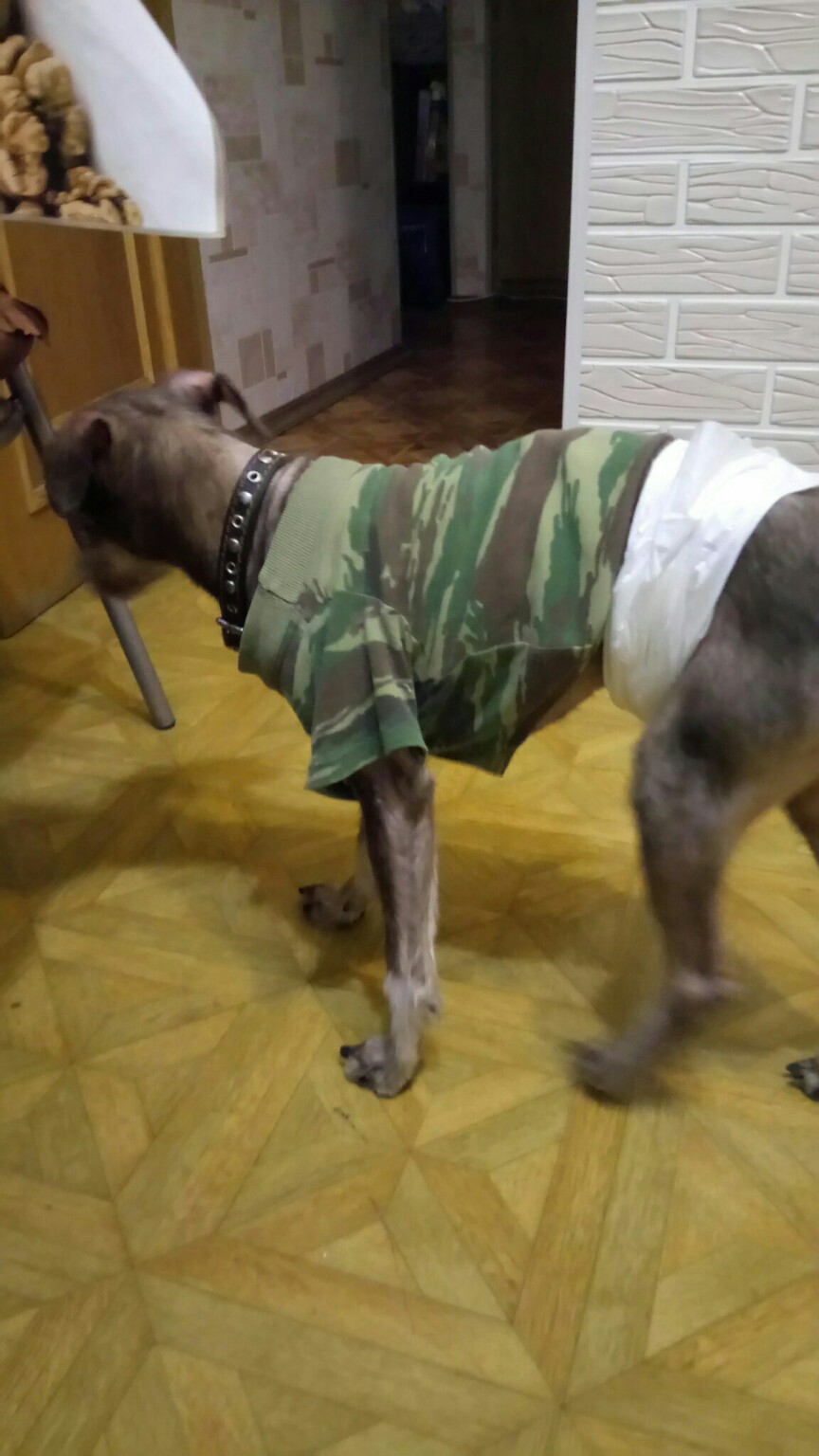 Фил, парень не мелкий, высоколапый 38+ в холке на вид будет, не стали мерить, он и так, когда увидел одежду и пакет с памперсами забился под стол, да в общем пока сидели на кухне, он лежа на своем месте под батареей периодически гундел вслух, приехали тут визитеры с "непонятными призентами" :laugh: