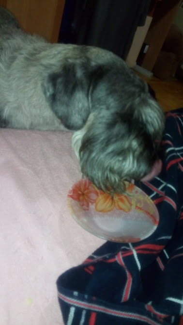 Разбаловали "деточку". На тебе виноградинку - ну должна же собачка витамины получать. На тебе половинку яичка на засладочку. Давай в мисочку еще кусочек картошечки положу.