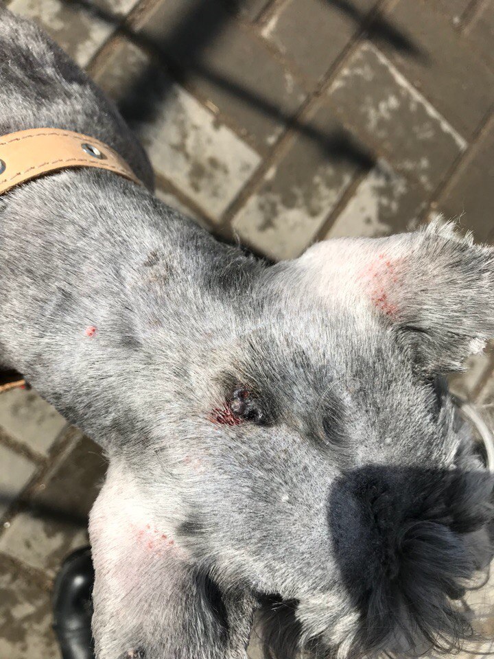 ...Собака на задних лапах стоять не может . Шишки под кожей , по всему телу, живот сплошная гематома. В паху огромная шишка типа грыжи. Глаза походу не видят , зубы передние сломаны....